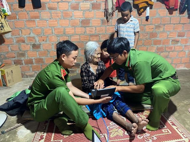 Cán bộ công an xã giúp người già về kích hoạt mã định danh điện tử