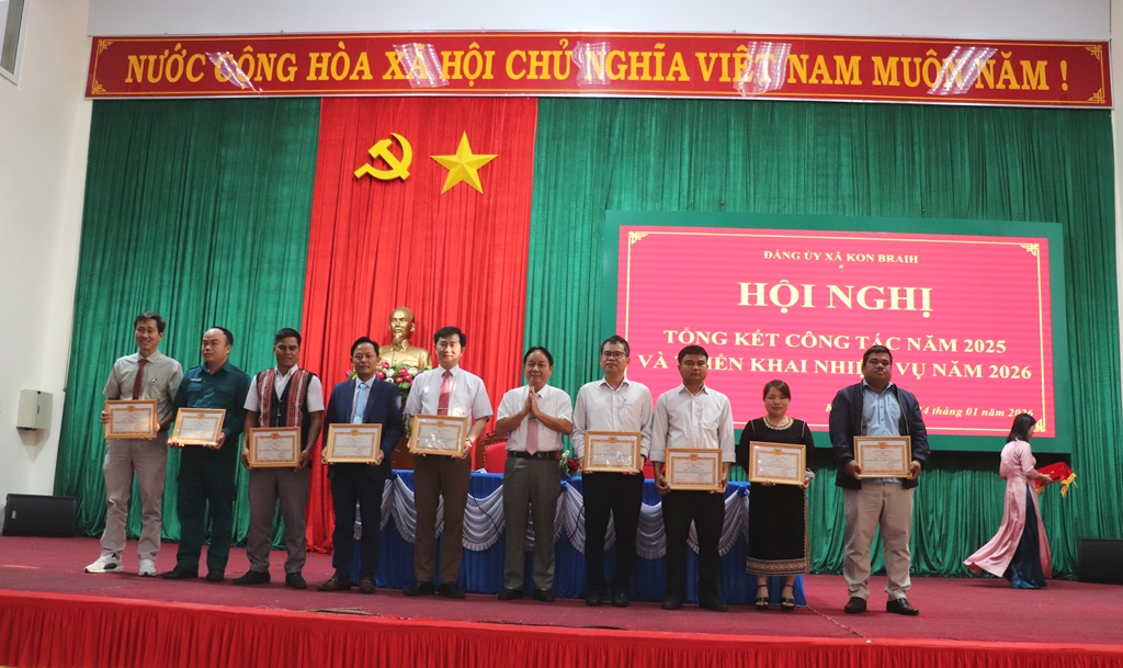 Nhân dịp này, Đảng ủy xã Kon Braih đã trao khen thưởng cho 50 đảng viên đạt tiêu chuẩn “Hoàn thành xuất sắc nhiệm vụ” năm 2025 và 05 đảng viên đạt tiêu chuẩn “Hoàn thành xuất sắc nhiệm vụ” 05 năm liền 2021-2025.