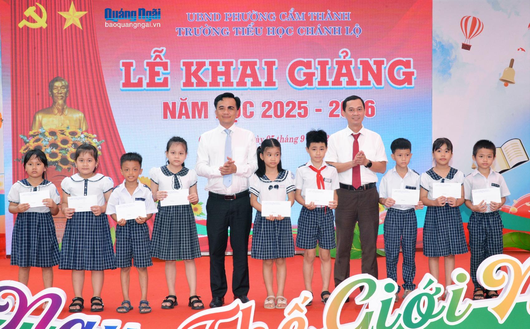 Lãnh đạo phường Cẩm Thành trao học bổng cho các học sinh Trường Tiểu học Chánh Lộ.