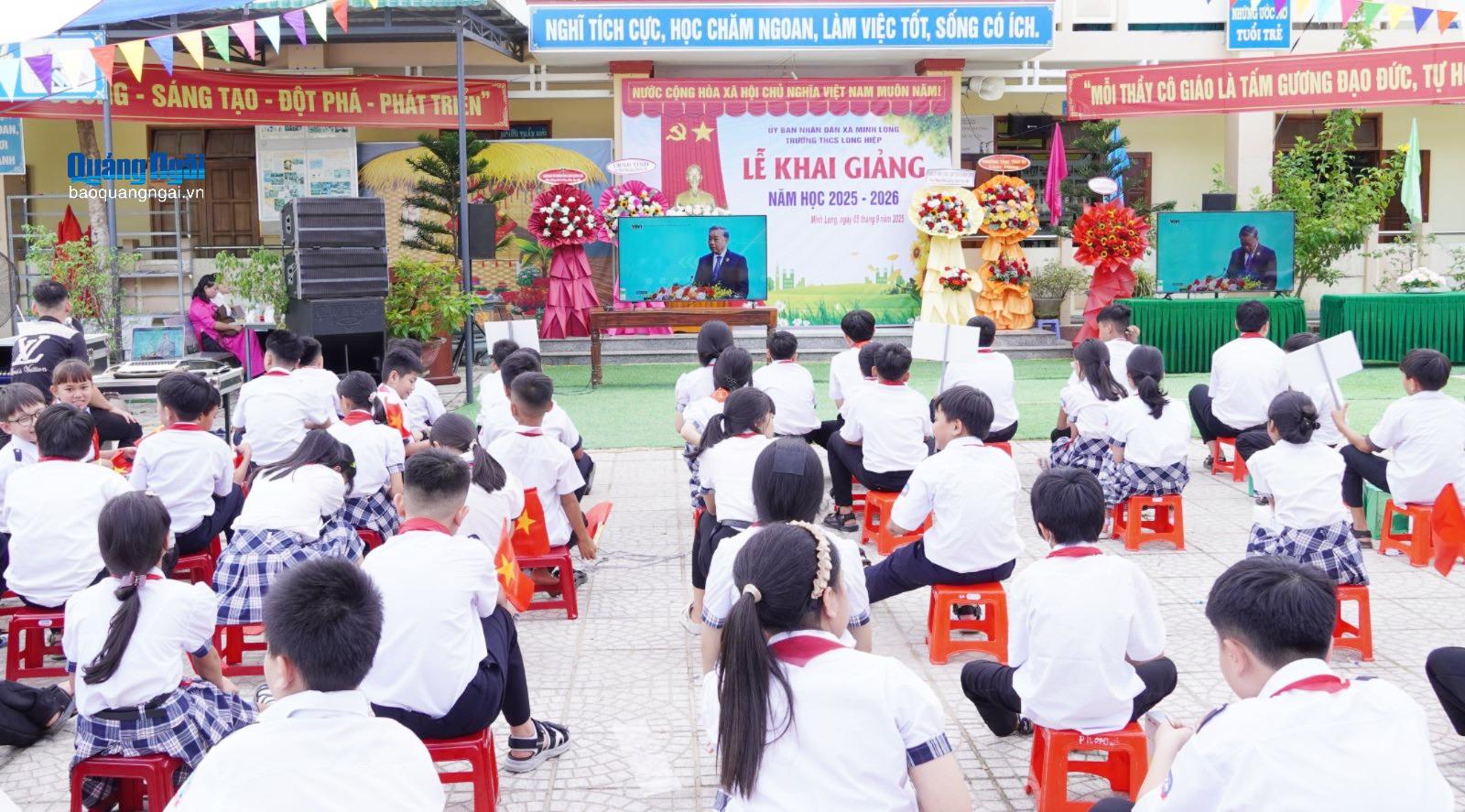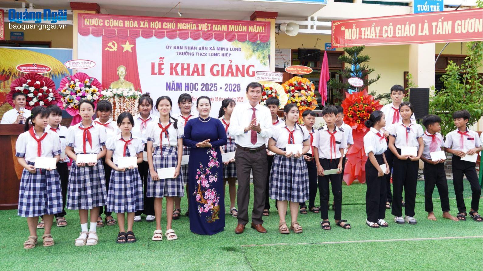 * Sáng 5/9, hòa chung không khí khai giảng năm học mới, hơn 300 thầy và trò Trường THCS Long Hiệp, xã Minh Long đã tổ chức khai giảng năm học mới 2025 - 2026. Tham dự khai giảng có Phó Bí thư Tỉnh ủy Đinh Thị Hồng Minh cùng lãnh đạo Sở GD&ĐT và địa phương.