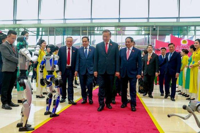 Tổng Bí thư Tô Lâm, Chủ tịch nước Lương Cường, Thủ tướng Phạm Minh Chính, Chủ tịch Quốc hội Trần Thanh Mẫn với các đồng chí lãnh đạo, đại biểu dự đại hội.