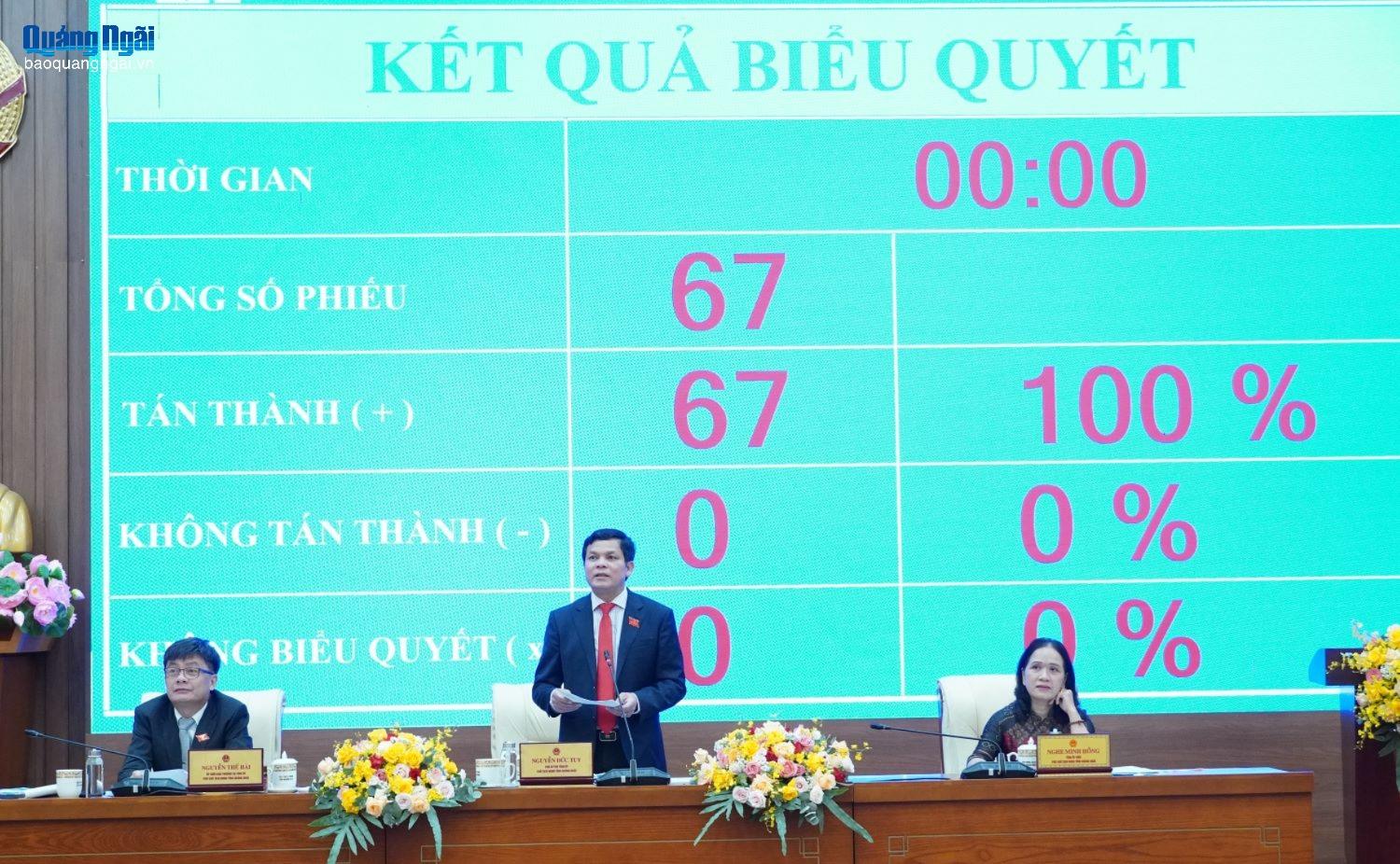 Tại kỳ họp, đại biểu HĐND tỉnh cũng đã thảo luận và thông qua các nghị quyết gồm: Nghị quyết về việc điều chỉnh kế hoạch đầu tư công trung hạn giai đoạn 2021 - 2025 và kế hoạch vốn năm 2025 nguồn vốn ngân sách địa phương; Nghị quyết về việc bổ sung công trình, dự án thu hồi đất năm 2025 trên địa bàn tỉnh; Nghị quyết về chủ trương chuyển đổi mục đích sử dụng rừng sản xuất sang mục đích khác để thực hiện công trình đường ven biển Dung Quất - Sa Huỳnh, giai đoạn IIb, đoạn Km76+230 - Km82+000; Nghị quyết quy định mức hỗ trợ khắc phục dịch bệnh động vật trên địa bàn tỉnh.