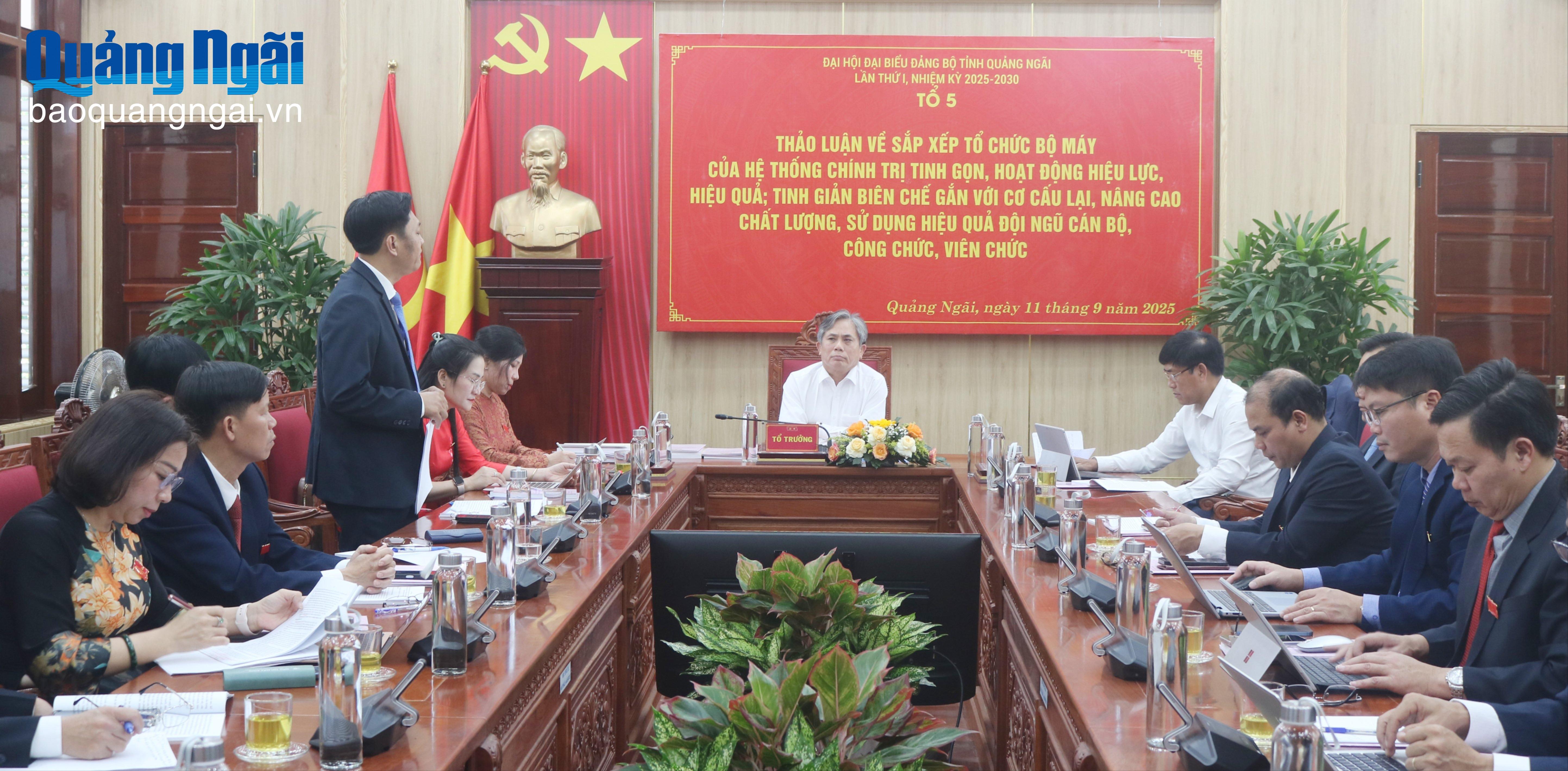 * Tại Tổ số 5 do Ủy viên Ban Thường vụ, Trưởng ban Tổ chức Tỉnh ủy Lữ Ngọc Bình làm Tổ trưởng, các đại biểu đã tập trung thảo luận về sắp xếp tổ chức bộ máy của hệ thống chính trị tinh gọn, hoạt động hiệu lực, hiệu quả; tinh giản biên chế gắn với cơ cấu lại, nâng cao chất lượng, sử dụng hiệu quả đội ngũ cán bộ, công chức, viên chức.
