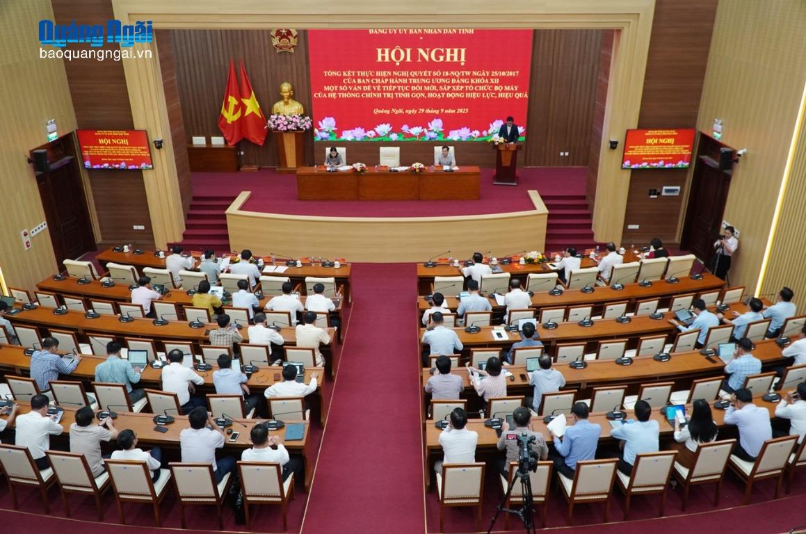 Phó Bí thư chuyên trách Đảng ủy UBND tỉnh Đinh Quốc Tuấn thay mặt Đảng ủy UBND tỉnh trình bày báo cáo kết quả thực hiện Nghị quyết 18-NQ/TW của các cấp, các ngành. Trong đó khẳng định, Đảng ủy UBND tỉnh đã lãnh đạo UBND tỉnh chỉ đạo các cấp, các ngành tập trung thực hiện các nhóm nhiệm vụ giải pháp để sắp xếp tổ chức bộ máy.