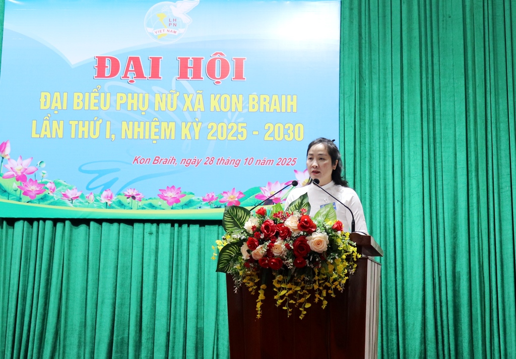 Phát biểu chỉ đạo tại Đại hội, đồng chí Chủ tịch Hội liên hiệp phụ nữ tỉnh ghi nhận, biểu dương những kết quả đạt được của Hội LHPN xã Kon Braih trong nhiệm kỳ qua; đồng thời đề nghị Hội tiếp tục đổi mới mạnh mẽ nội dung, phương thức hoạt động Hội, lấy quyền lợi và nhu cầu chính đáng của phụ nữ làm trung tâm; tăng cường ứng dụng công nghệ số trong công tác tuyên truyền, vận động, điều hành. Đẩy mạnh phong trào phụ nữ giúp nhau phát triển kinh tế, hỗ trợ khởi nghiệp, khởi sự kinh doanh, nhân rộng các mô hình sinh kế hiệu quả, góp phần giảm nghèo bền vững. Tiếp tục chăm lo xây dựng gia đình no ấm, tiến bộ, hạnh phúc, văn minh; nhân rộng các mô hình “Gia đình 5 có, 3 sạch”, “Ngôi nhà an toàn cho phụ nữ và trẻ em”; chú trọng giáo dục đạo đức, lối sống, kỹ năng sống cho phụ nữ và trẻ em. Đặc biệt đông chí nhấn mạnh trong giai đoạn này, Hội phụ nữ xã Kon Braih quan tâm bồi dưỡng, nâng cao chất lượng đội ngũ cán bộ Hội cơ sở có bản lĩnh, phẩm chất, tâm huyết, năng lực, kỹ năng công tác vận động phụ nữ trong tình hình mới.