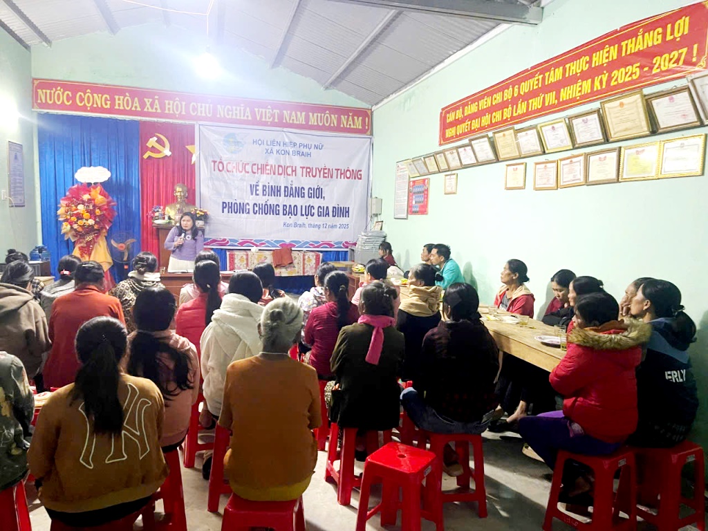 Nhằm tạo điều kiện để phụ nữ, đặc biệt là phụ nữ dân tộc thiểu số tham gia phát triển kinh tế, nâng cao quyền năng, cải thiện đời sống; trong tháng 12, Hội liên hiệp phụ nữ xã Kon Braih đã tổ chức 10 buổi truyền thông và 01 hội thi về bình đẳng giới, phòng chống bạo lực gia đình tại 10 thôn, làng với gần 1.300 lượt hội viên tham gia.
